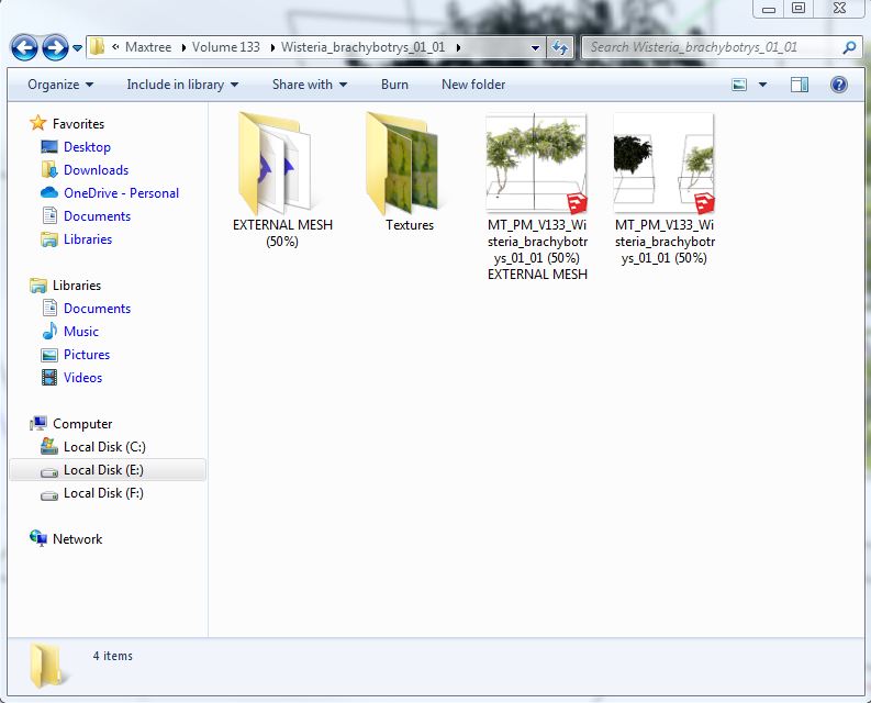 Attached are some images of mentioned wisteria model, organization of folders and usage in one of my latest renders. Original file have 377MB, and external mesh file have 17.8MB, while folder with IGS files have 49MB.