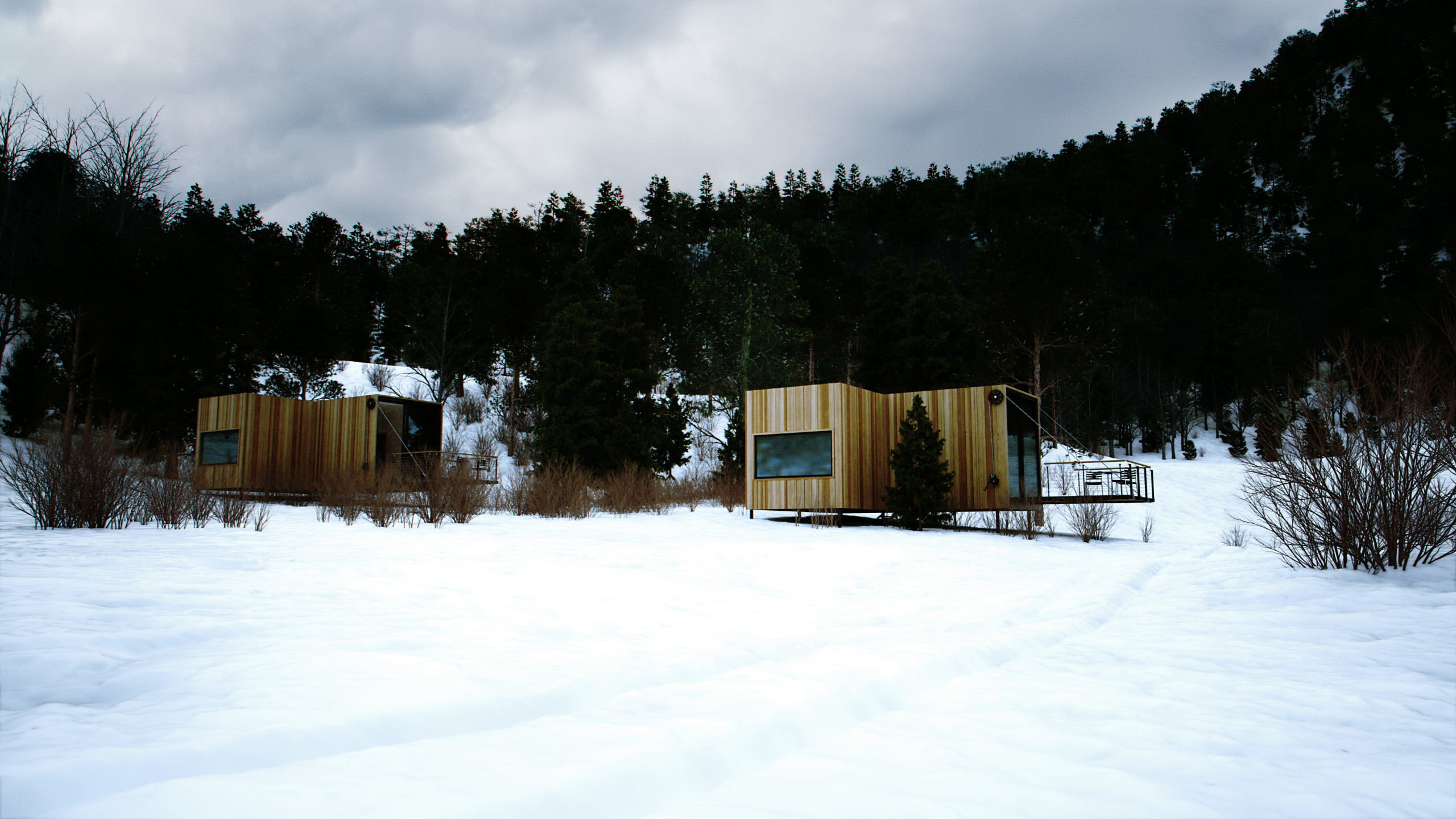 Snow is melting here so: This is a project I made 2 years ago for a friend. It was supposed to be a hotel made of several cabins. No luck, the project didn' t come true. The design is very inspired on the Juvet landscape hotel in Norway.