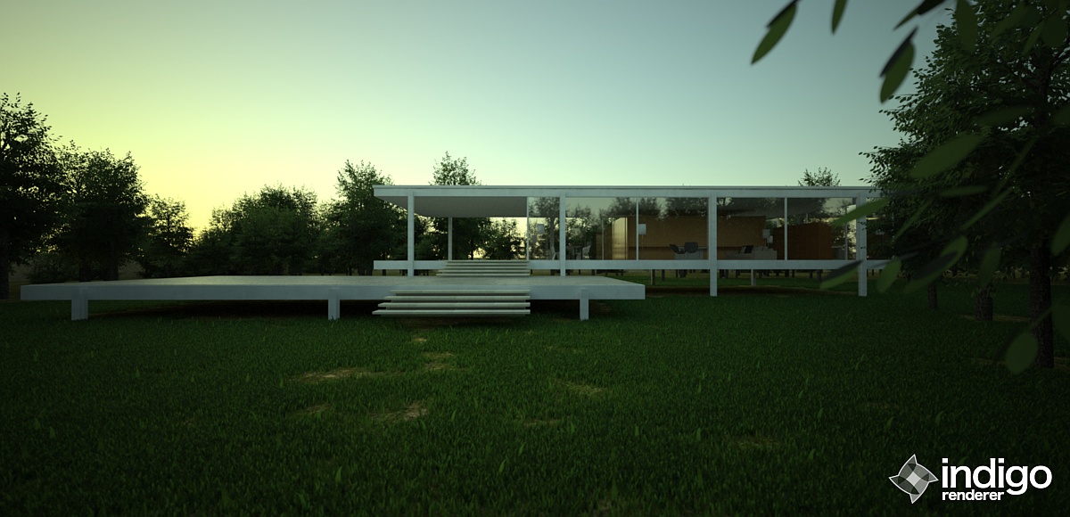 For the architectural model, I chose the Farnsworth house because there are a lot of very nice renders of it and photographs to compare with. The model of the house I am using was made by Peter Guthrie and it can be downloaded from his blog. My heartfelt thanks to him for sharing such a wonderful detailed model. He made a number of very realistic visualizations using the same model.