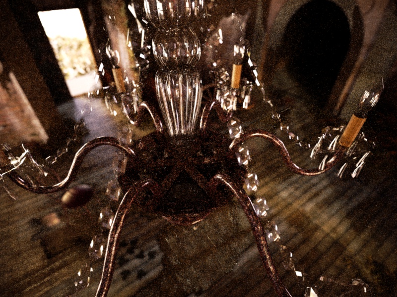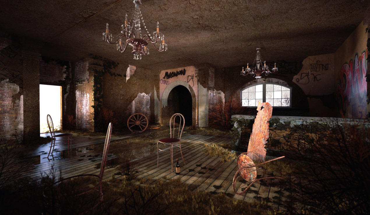 Bosseye, great stuff so far. There is almost an irony in the derelict environment and then the pristine chandelier in the middle. If that was intentional, then great idea! You could probably capitalise on that with some macros... - ahem - I think I have fuelled my fellow competitors enough...